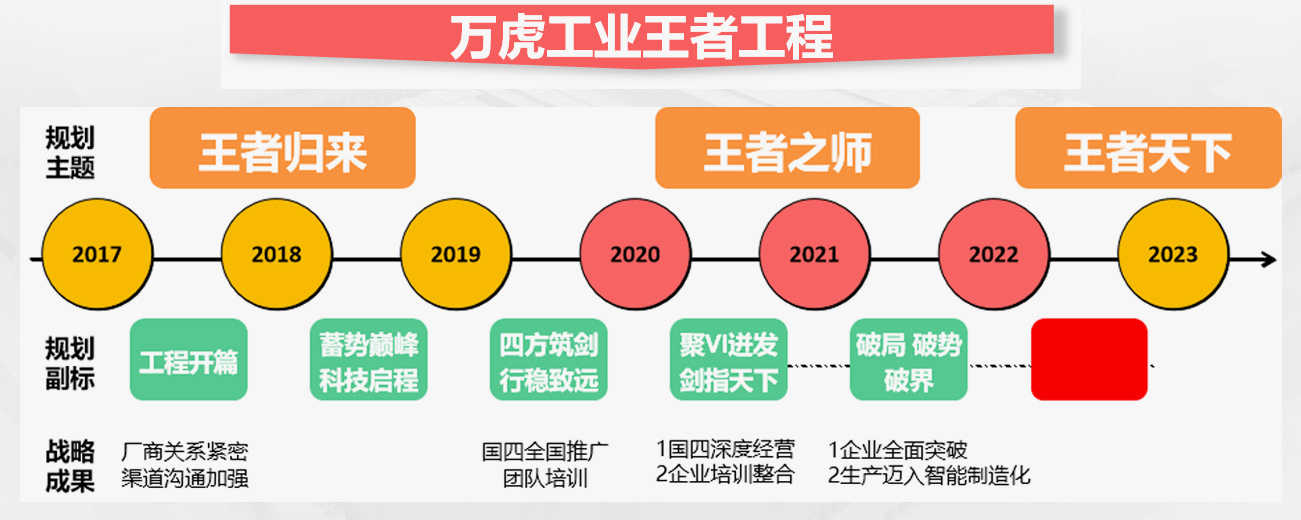 王者工程的打造將徹底突破現(xiàn)有萬虎工業(yè)發(fā)展格局,實現(xiàn)研發(fā)、制造、品質(zhì)、營銷、服務(wù)、價值鏈多重因素合一,為企業(yè)產(chǎn)業(yè)多元拓展和寡頭地位做準(zhǔn)備。
